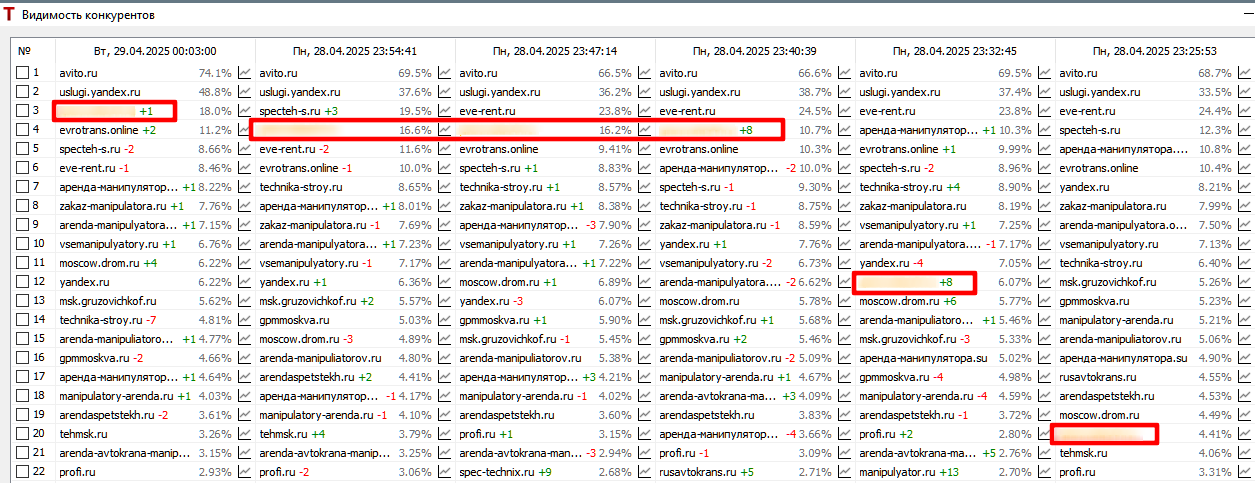 Мы в ежедневном режиме следим за динамикой продвижения, снимаем параметры и работаем над увеличением запросов в ТОПЕ поисковых систем.